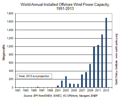 Offshore wind power installations are on track to hit a seventh consecutive annual record in 2013. Developers added 1,080 megawatts of generating capacity in the first half of the year, expanding the world total by 20 percent in just six months. Fifteen countries host some 6,500 megawatts of offshore wind capacity. Before the year is out, the world total should exceed 7,100 megawatts. Although still small compared with the roughly 300,000 megawatts of land-based wind power, offshore capacity is growing at close to 40 percent a year.